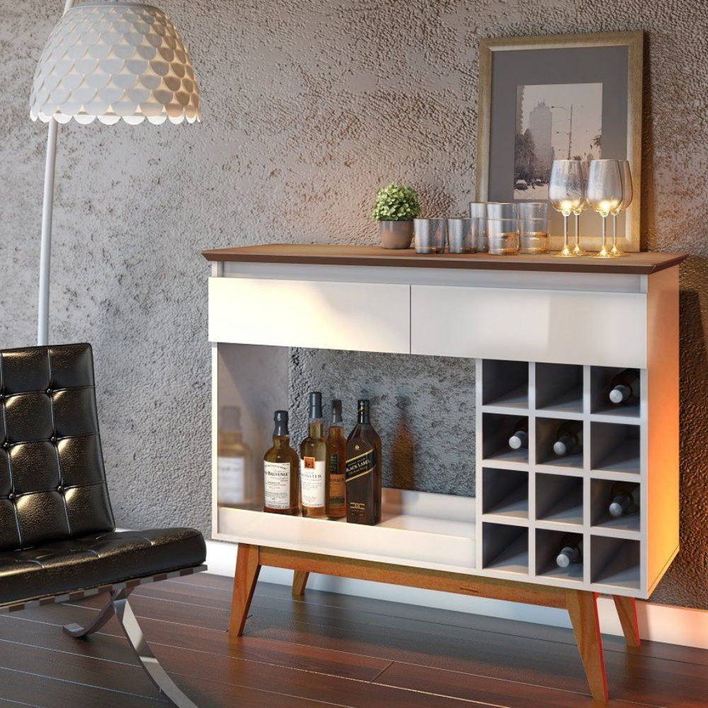 O tampo em MDF 25mm com corte preciso em 45º e os pés em madeira maciça conferem uma estética de marcenaria fina, elevando visualmente o ambiente além da Funcionalidade Premium, da experiência suave, das corrediças telescópicas nas gavetas e capacidade para 12 garrafas em um Aparador Adega elegante.