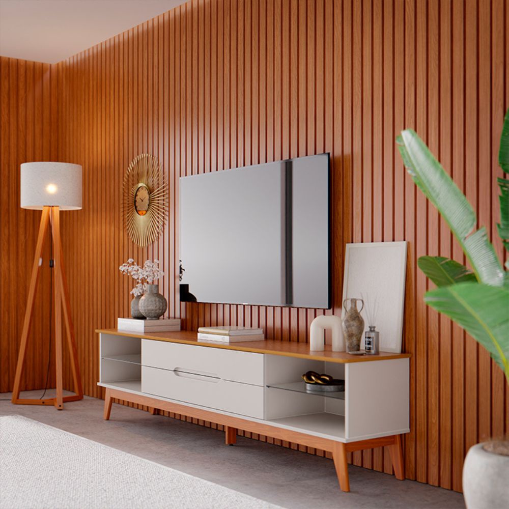 Dê um toque de sofisticação à sua sala com este rack moderno, que combina linhas limpas com um acabamento refinado. Seu design conta com pés palito em madeira, nichos laterais abertos e gaveta central espaçosa, ideal para manter tudo organizado com estilo.